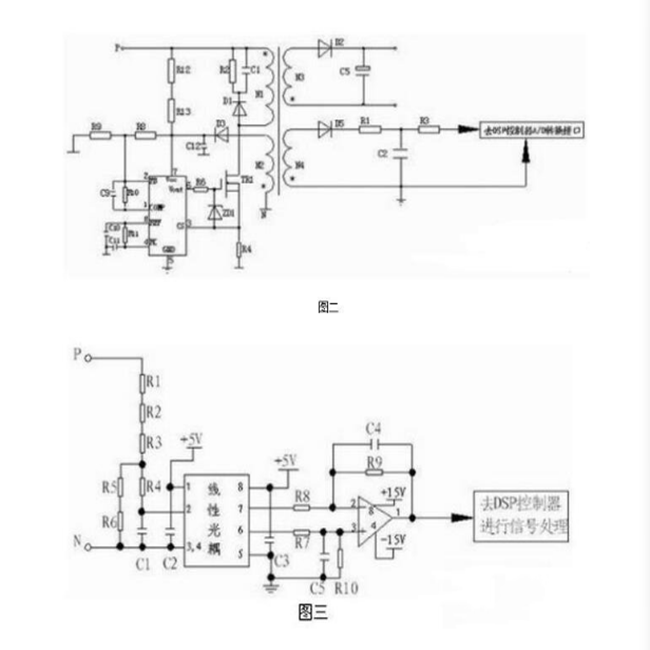 直流母線電壓的讀取,驅(qū)動(dòng)器CPU無(wú)法讀取很高的電壓,所以必需得通過(guò)電路轉(zhuǎn)化將高電壓轉(zhuǎn)化為CPU可以讀取的低電壓,常見(jiàn)的有變壓器輸出讀取法和電阻降壓讀取法,見(jiàn)圖二,圖三。